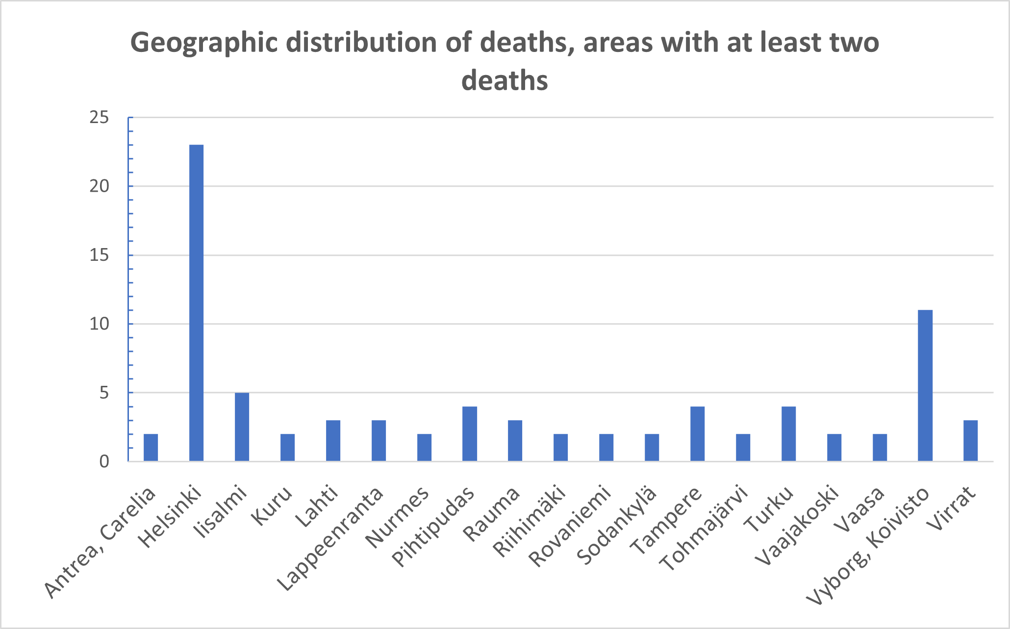 Statistics show that police work is riskiest in the largest cities, such as Helsinki and Tampere. Until 1944, police work was especially dangerous in the Karelian region, where Vyborg was located. Specific risk factors included alcohol smuggling and the presence of illegal intelligence operatives and paratroopers in the area. Individual wartime events, such as the bombing of Iisalmi in February 1940, increased the number of police casualties in certain locations. Although the statistics indicate more police work in urban areas, violence has also occurred in rural regions. A single, exceptional event can significantly increase the number of victims in a given locality. One example of this is the number of police fatalities in Pihtipudas in 1969.