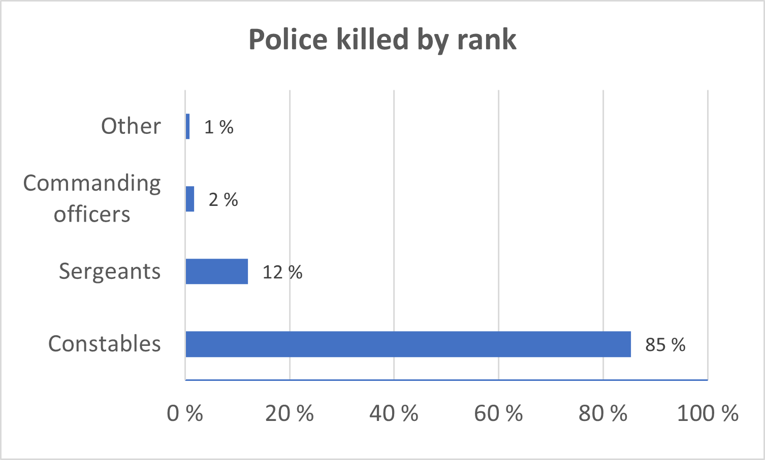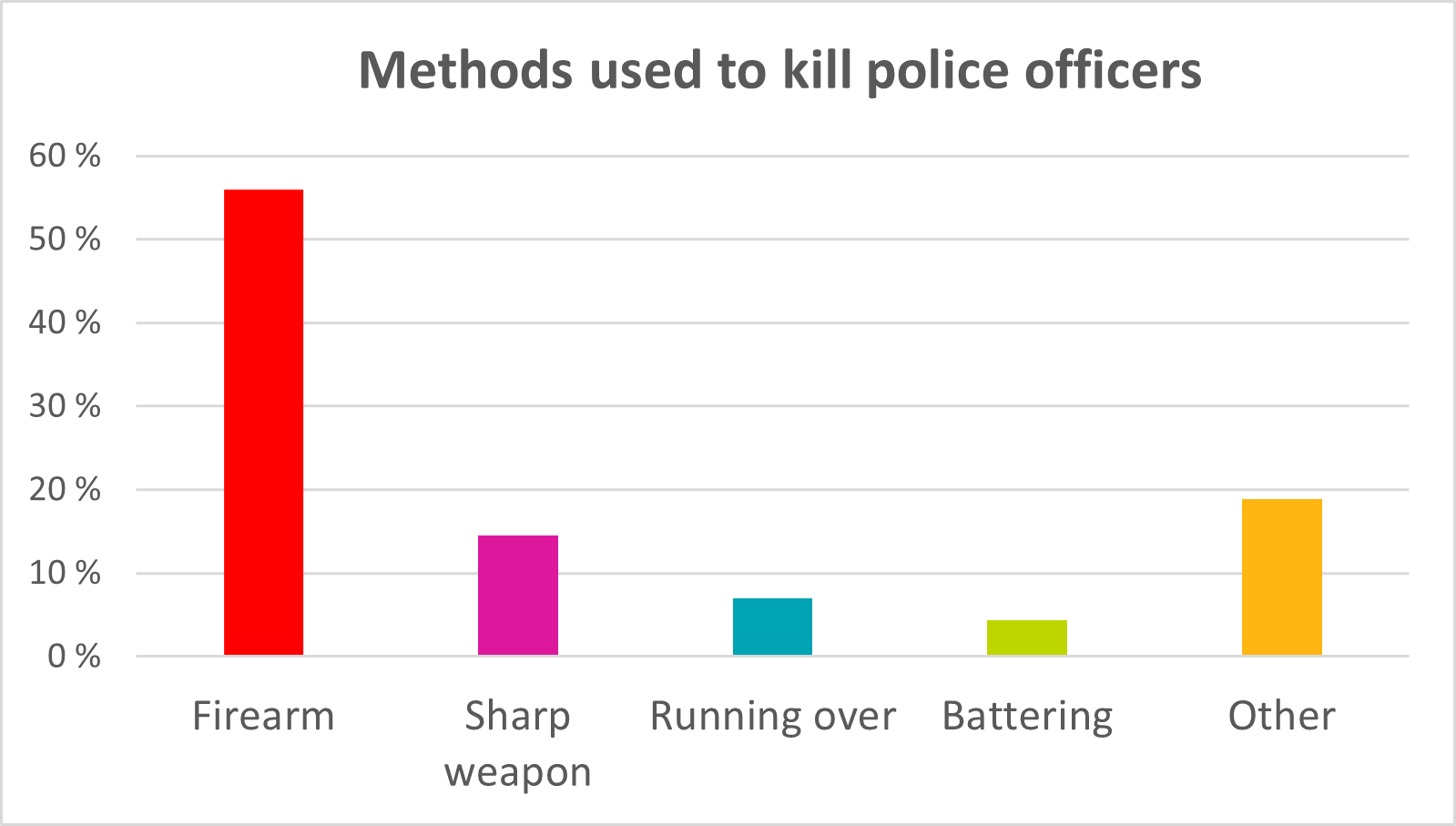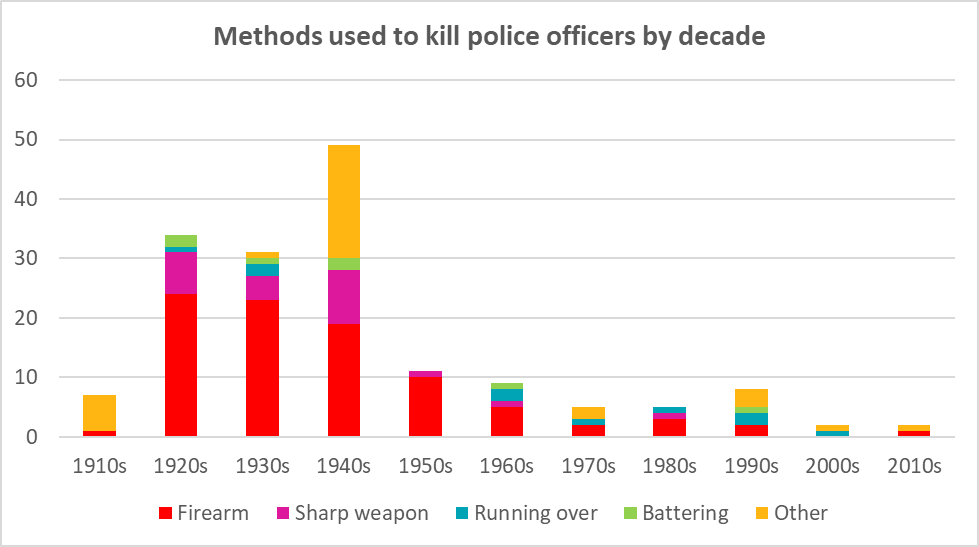 Our online database of police fatalities contains 164 police deaths. 72.5% of the police fatalities were the result of violence, corresponding to 119 police officers. 56% of police fatalities were committed by firearm. This remains the dominant cause of fatalities today. Bladed weapons account for the next highest number of deaths, at around 14%.